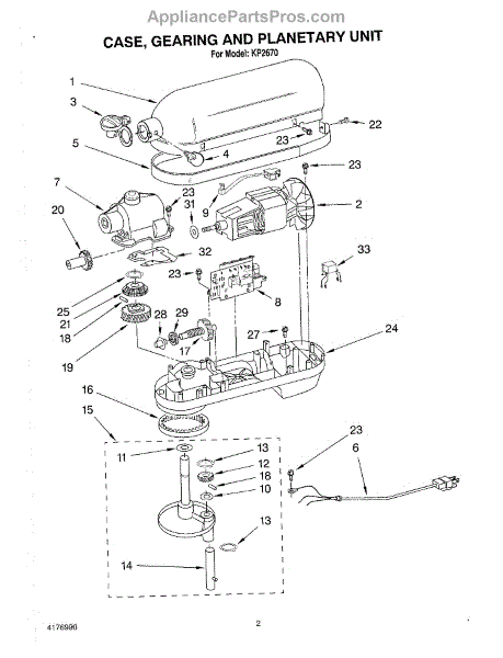 This lower gearcase housing encloses and supports the planetary and lower gear train in a stand mixer. Replacing a damaged housing restores alignment and helps contain lubrication for quieter, consistent mixing performance.