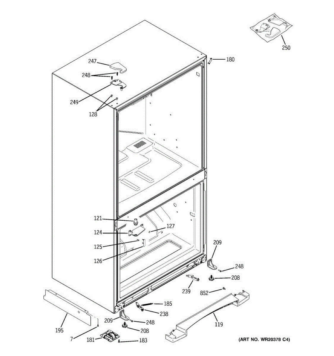 Secures the door hinge pin and keeps the refrigerator door aligned. Replace if cracked, broken, or missing to prevent door sag and uneven gaps.