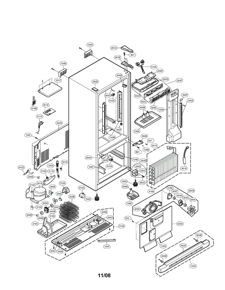 The Case Assembly is an OEM part for LG side-by-side refrigerators housing electronic display modules. This assembly securely mounts LCD panels governing temperature readings and interface menus.