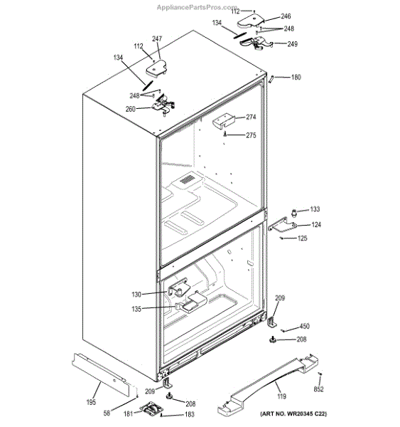 This leveling screw threads into the refrigerator's leveling leg or adjuster bracket to raise or lower the cabinet. Replacing a stripped or missing screw restores stable footing and helps keep doors aligned for proper sealing.