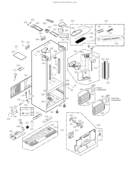 The Compressor is an OEM part for LG refrigerators. As the primary component that circulates refrigerant to chill the refrigerator and freezer compartments, it is crucial for proper cooling operation. The compressor works with the condenser fan and evaporator coil to regulate temperatures inside the refrigerator.