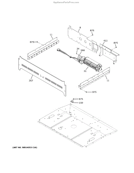 The Cooling Fan Lower is an OEM part for GE wall ovens. It circulates air through the oven, which helps maintain an even cooking temperature inside the oven cavity.