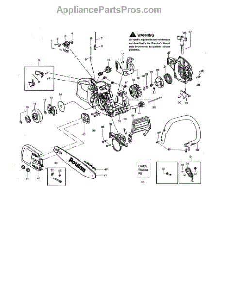 This clutch washer kid includes a clutch, a washer, and a clip. A washer helps to protect the engine from unwanted pressure at the joint where two parts connect. Washers help to spread the pressure evenly so that the fastener doesn’t move, which would cause corrosion and friction. Washers can wear down or corrode over time, leading to unwanted pressure in the chainsaw’s engine. Based on the location of this washer, replacing it may require different steps to take apart the engine. Be sure that the engine has cooled completely before attempting any repairs. This part is compatible with Poulan and Craftsman chainsaws and is a genuine OEM part sourced directly from the manufacturer.