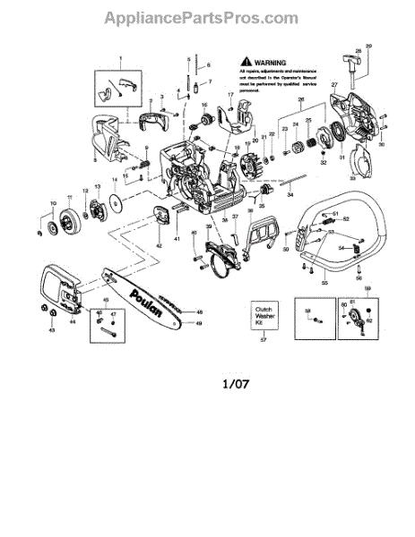 This clutch washer kid includes a clutch, a washer, and a clip. A washer helps to protect the engine from unwanted pressure at the joint where two parts connect. Washers help to spread the pressure evenly so that the fastener doesn’t move, which would cause corrosion and friction. Washers can wear down or corrode over time, leading to unwanted pressure in the chainsaw’s engine. Based on the location of this washer, replacing it may require different steps to take apart the engine. Be sure that the engine has cooled completely before attempting any repairs. This part is compatible with Poulan and Craftsman chainsaws and is a genuine OEM part sourced directly from the manufacturer.