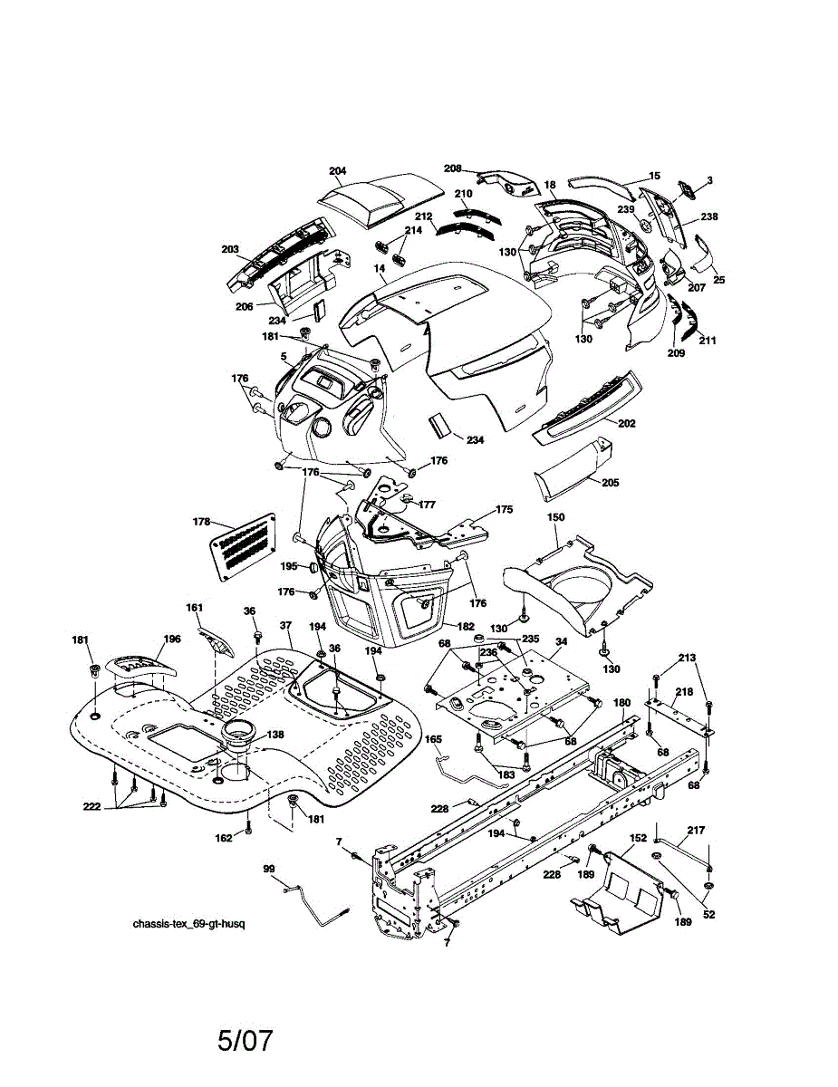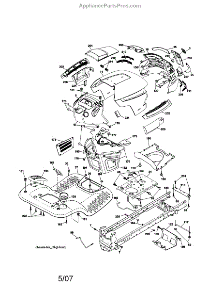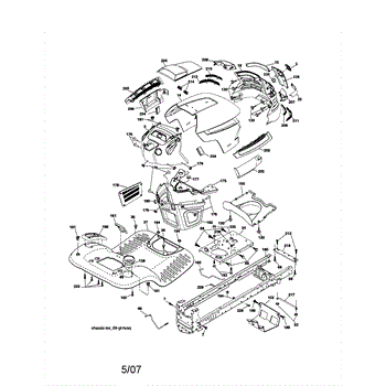 Main chassis frame assembly for riding mowers and lawn tractors. Replace this welded structural component if cracked, bent, or damaged from impact.