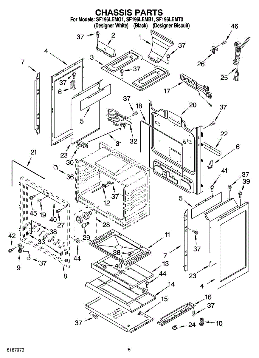 Fastens panels, brackets, and trim pieces on ranges and vacuums. Replace this screw if missing, stripped, or damaged to secure loose components and prevent rattling or misalignment.