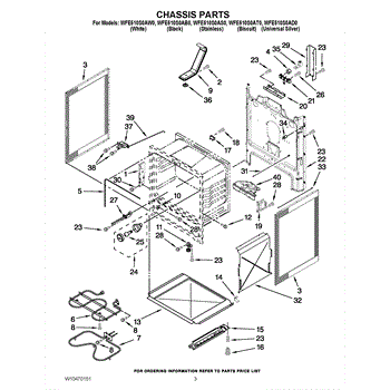 Fiberglass insulation installs behind oven and broiler walls to contain heat within the cavity. Replace if worn, compressed, damaged, or missing for safety.