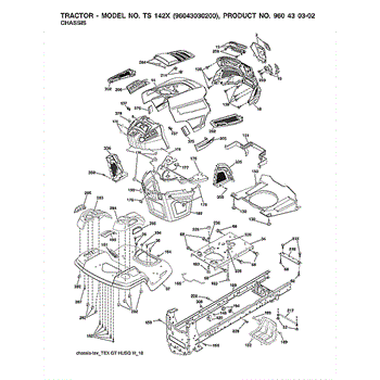 Main chassis frame assembly for riding mowers and lawn tractors. Replace this welded structural component if cracked, bent, or damaged from impact.