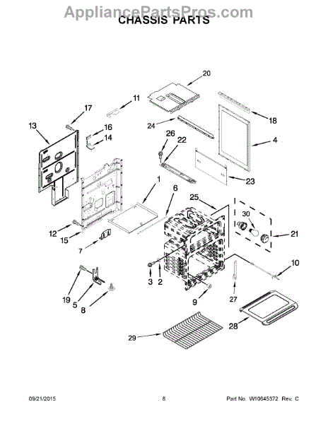Replacement side panel assembly for gas ranges and ovens. Restores exterior appearance when original panel is cracked, dented, rusted, or bent. Mounts to frame.