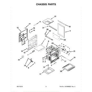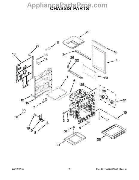 Replacement side panel assembly for gas ranges and ovens. Restores exterior appearance when original panel is cracked, dented, rusted, or bent. Mounts to frame.