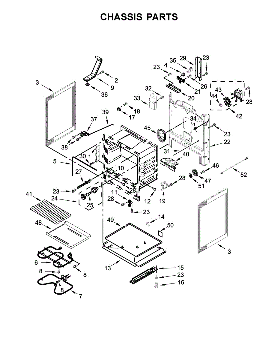 Fiberglass insulation installs behind oven and broiler walls to contain heat within the cavity. Replace if worn, compressed, damaged, or missing for safety.