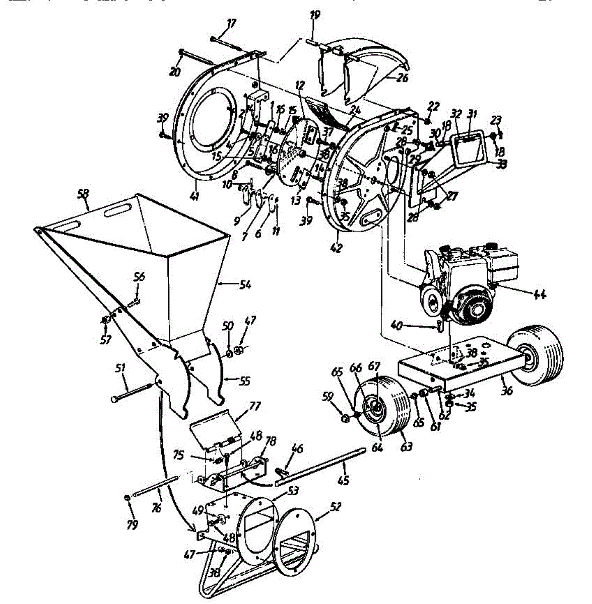 Rotating impeller assembly for chipper shredders. Processes leaves, yard waste, and limbs. Replace if cracked, damaged, or worn to restore chipping action.