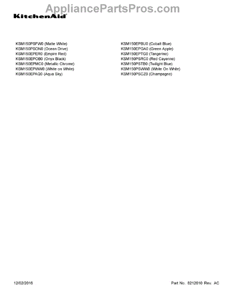 Parts for Whirlpool KSM150PSWW0: 02 - Color Variation Parts