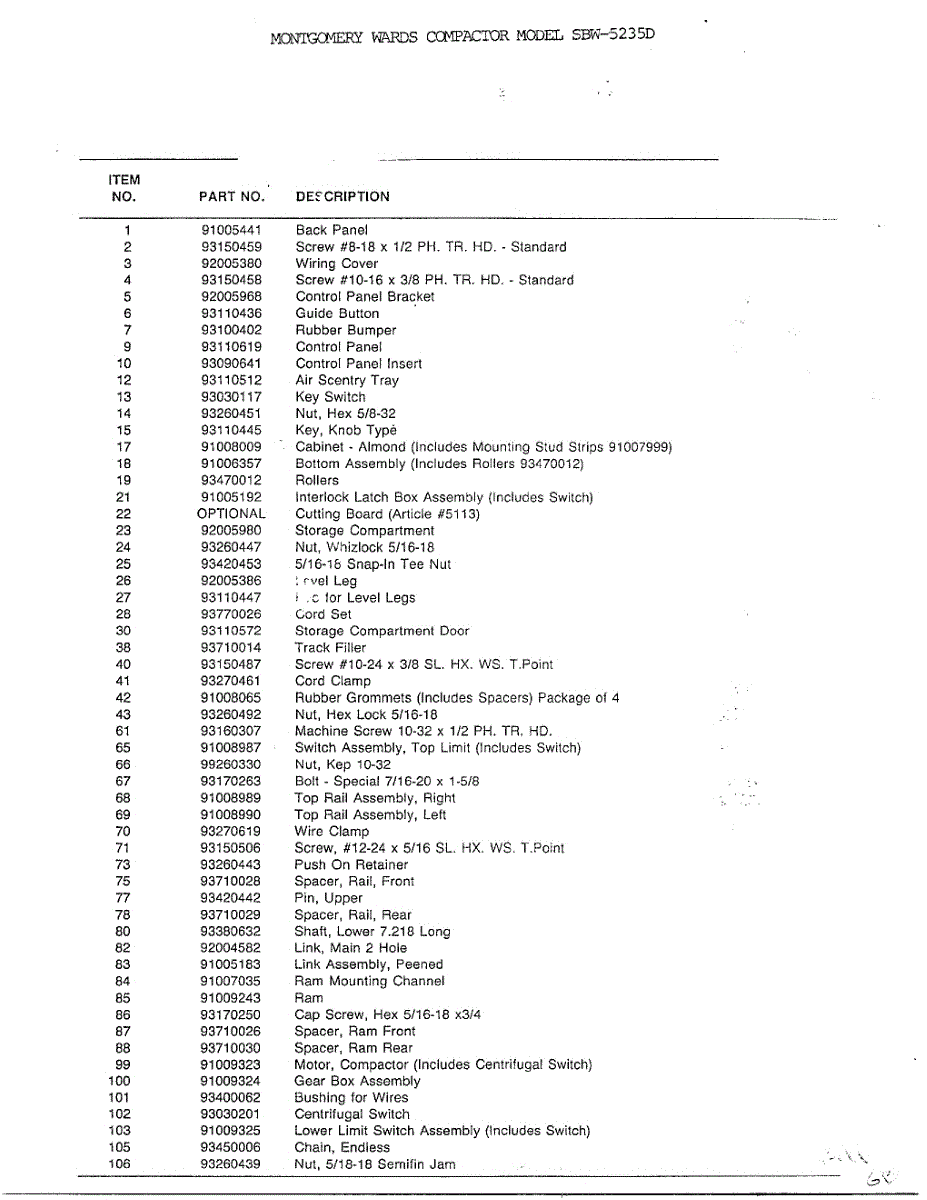 Mounting screw for trash compactor assembly. Secures internal components and panels. Replace if screw is stripped, missing, or damaged during maintenance.