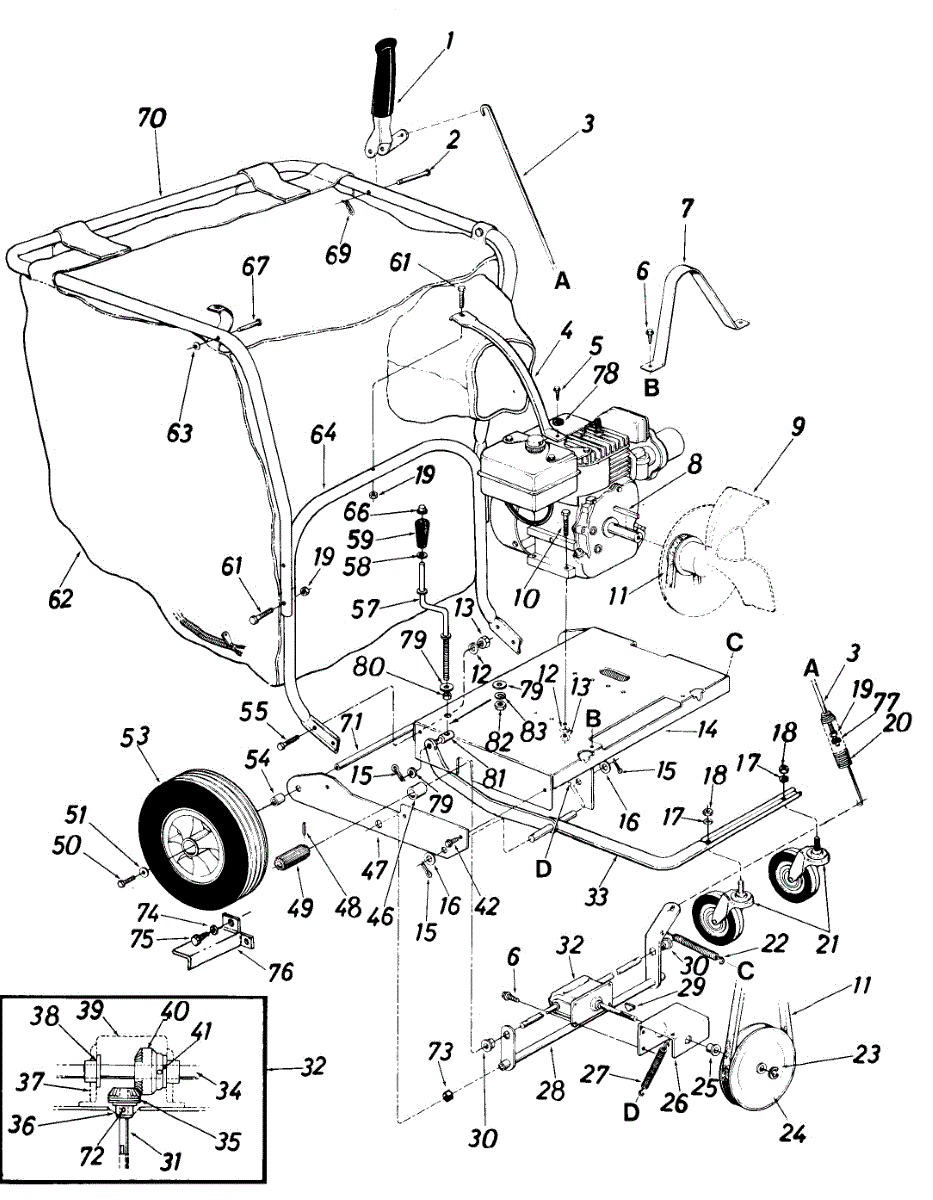 Caster arm assembly for blowers and outdoor power equipment. Replaces broken, cracked, or worn wheel mounting arms for stable mobility and support.