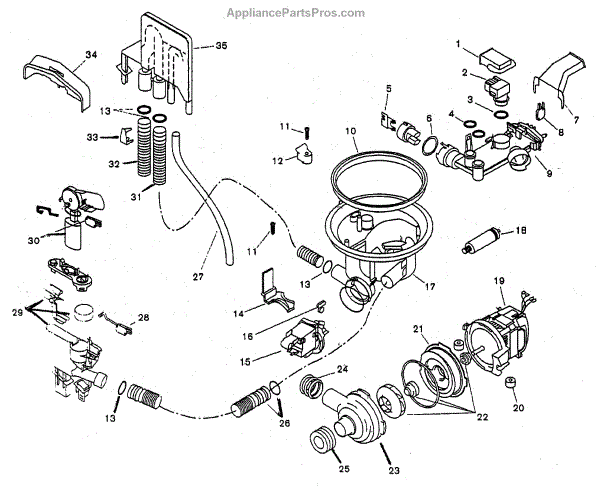 This rear pump housing is the dishwasher's molded enclosure that supports the drain/pump assembly and channels wash and drain water. Replacing a damaged housing restores proper water flow and helps stop leaks. What it does: