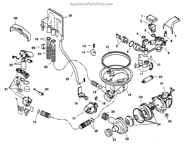 This rear pump housing is the dishwasher's molded enclosure that supports the drain/pump assembly and channels wash and drain water. Replacing a damaged housing restores proper water flow and helps stop leaks. What it does: