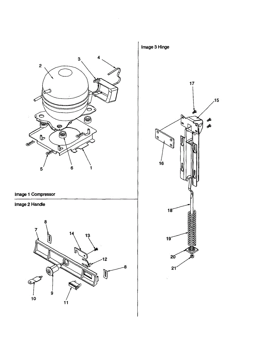 Parts for Amana AC50KW-P1317817WW: Compressor, Hinge And Lock Parts