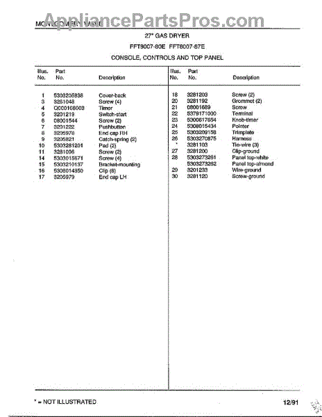 Parts for Frigidaire 8007-87D: Console / Controls And Top Panel Parts