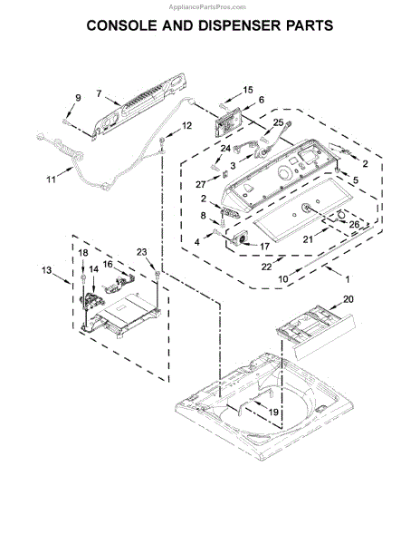 The Dispenser Drawer is an OEM part for Whirlpool top-loading washers. Located internally at the top, it houses separate chambers for laundry detergent and fabric softener.