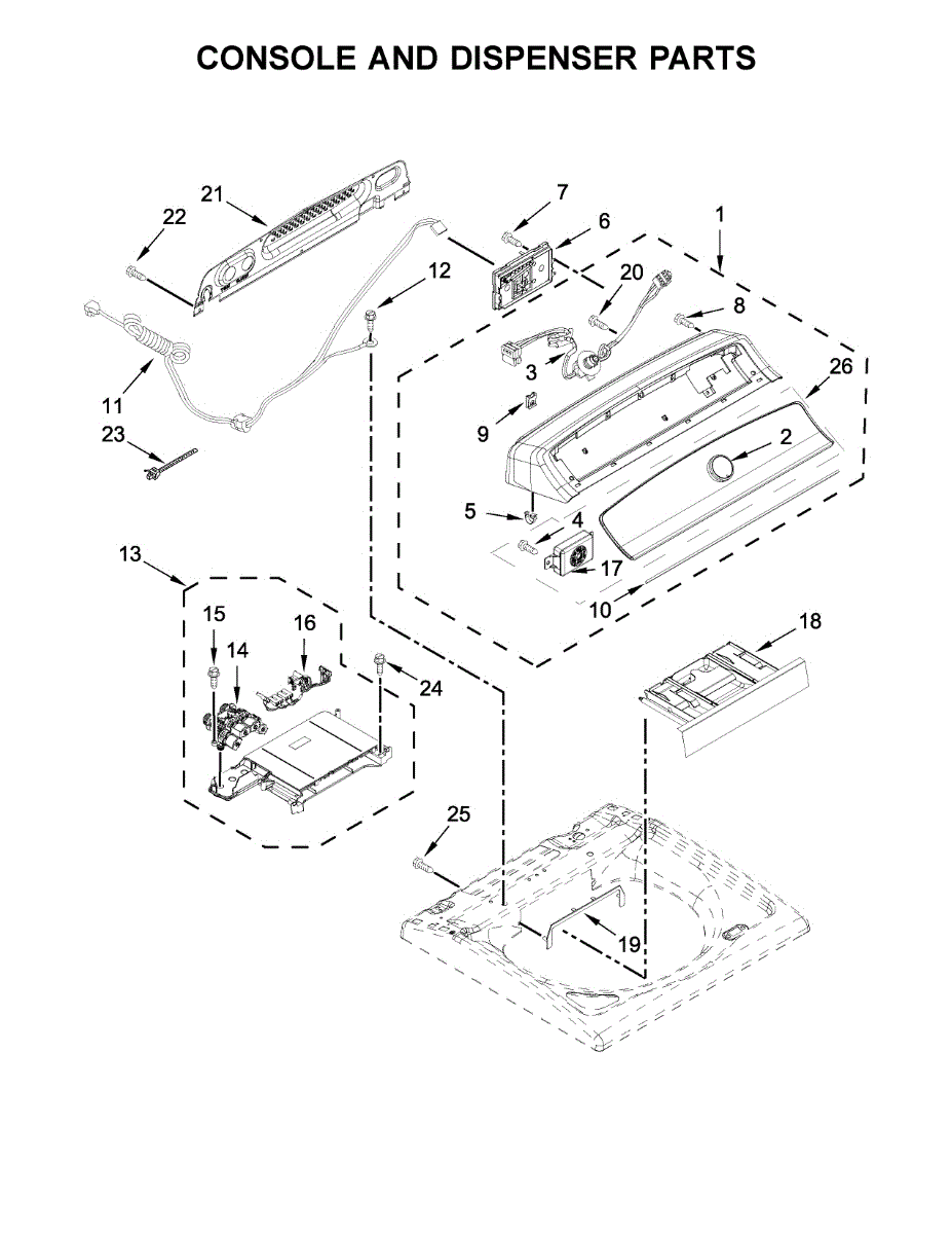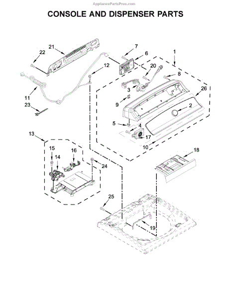This is a Whirlpool washer main console. The main console is the component at the top of the washer containing the control knobs. Any burning smell from the console or control board could indicate a short panel, and use should be discontinued immediately. If controls are unresponsive, use a voltage tester to check the control board and any connections to verify that the control board is faulty.Remove the old console by unscrewing the top screws on the back panel. There should be two clips that fasten the console in place. Remove these with a flathead screwdriver. The product was sourced directly from the manufacturer as a genuine OEM part. This washer console is sold individually. This part is compatible with Whirlpool, Roper, JennAir, Maytag, and Magic Chef.