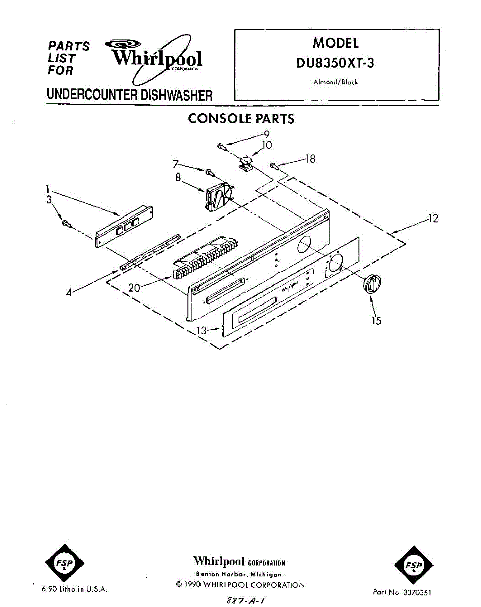 Parts for Whirlpool DU8350XT3: 01 - Console Parts