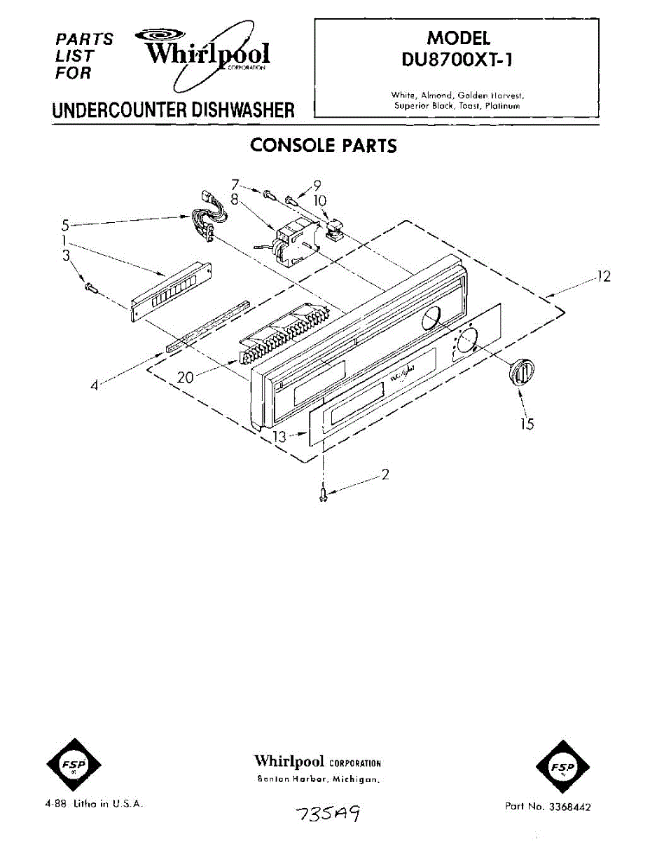 Parts for Whirlpool DU8700XT1: 01 - Console Parts
