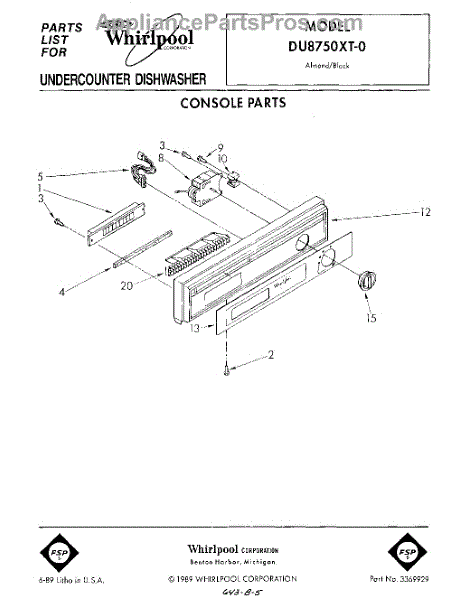Parts for Whirlpool DU8750XT0: 01 - Console Parts