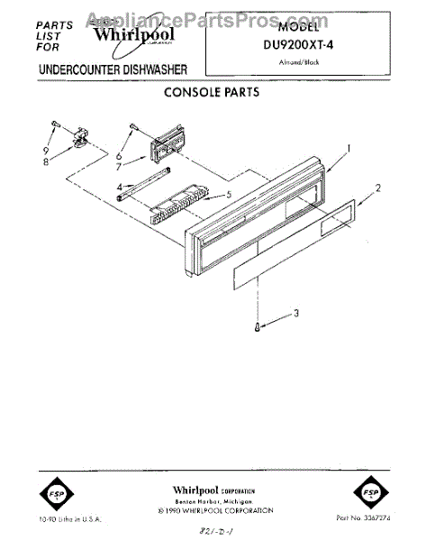 Parts for Whirlpool DU9200XT4: 01 - Console Parts