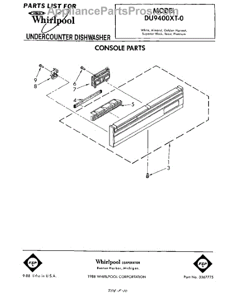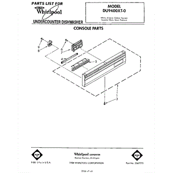 Parts for Whirlpool DU9400XT0: 01 - Console Parts