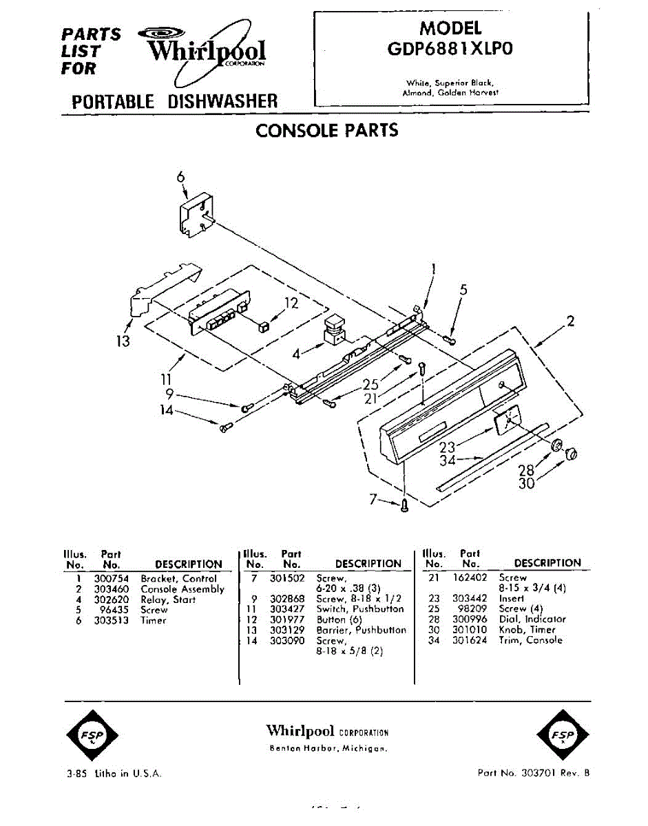 Parts for Whirlpool GDP6881XLP0: 01 - Console Parts