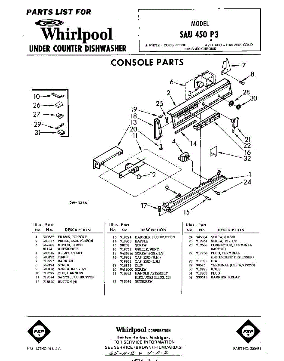 Parts for Whirlpool SAU450P3: 01 - Console Parts