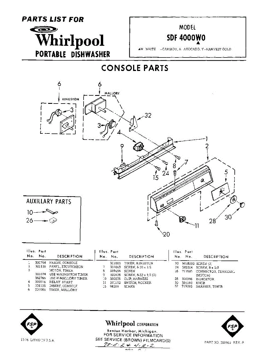 Parts for Whirlpool SDF4000W0: 01 - Console Parts
