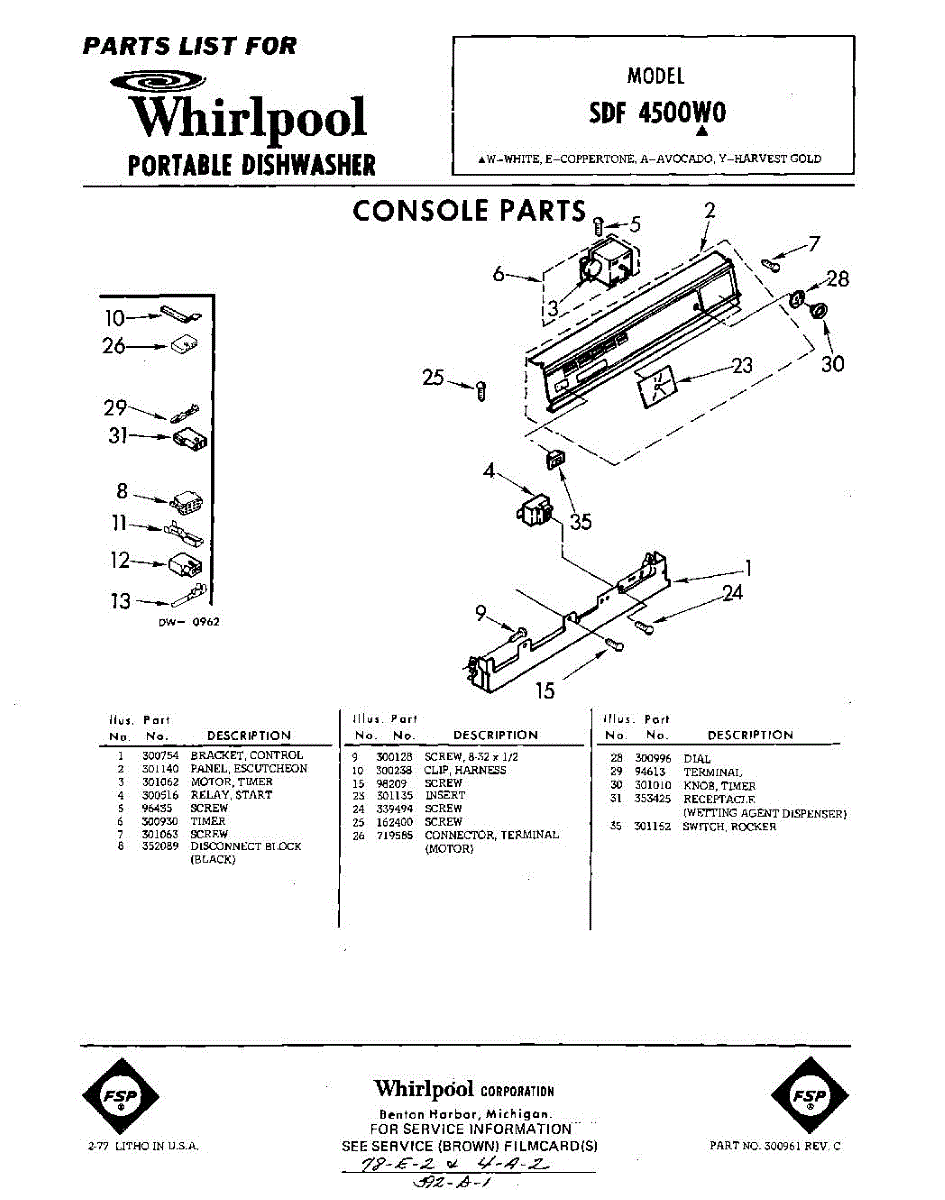 Parts for Whirlpool SDF4500W0: 01 - Console Parts