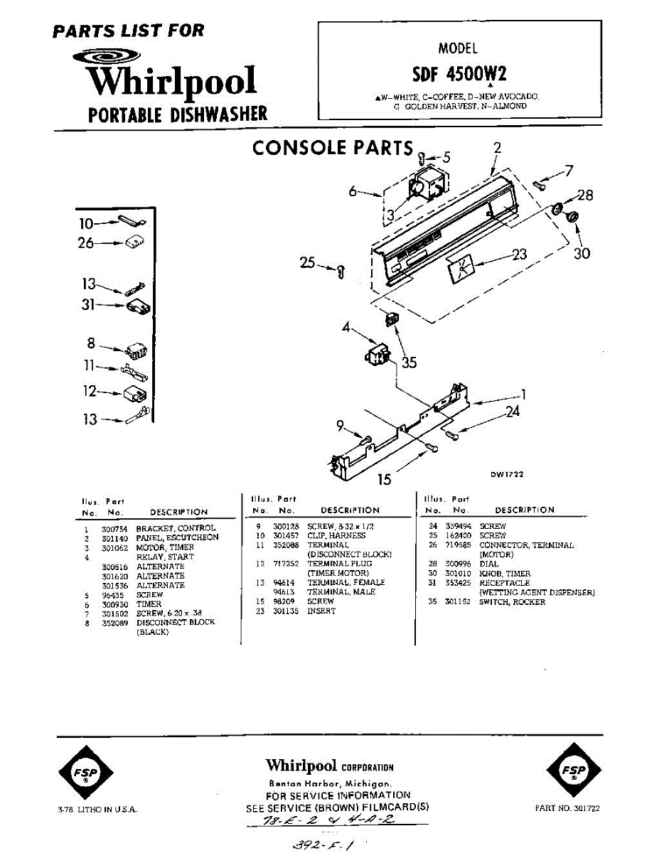 Parts for Whirlpool SDF4500W2: 01 - Console Parts