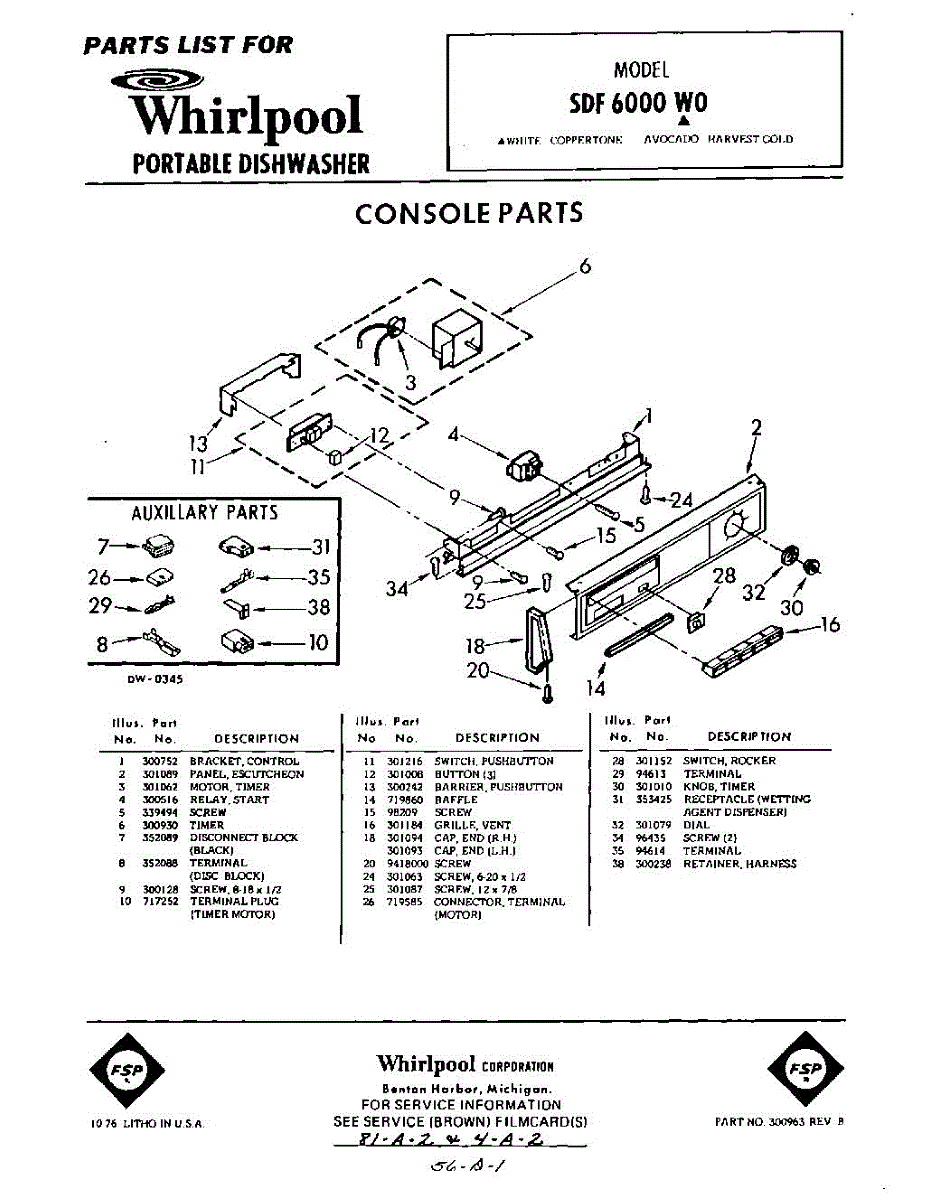 Parts for Whirlpool SDF6000W0: 01 - Console Parts