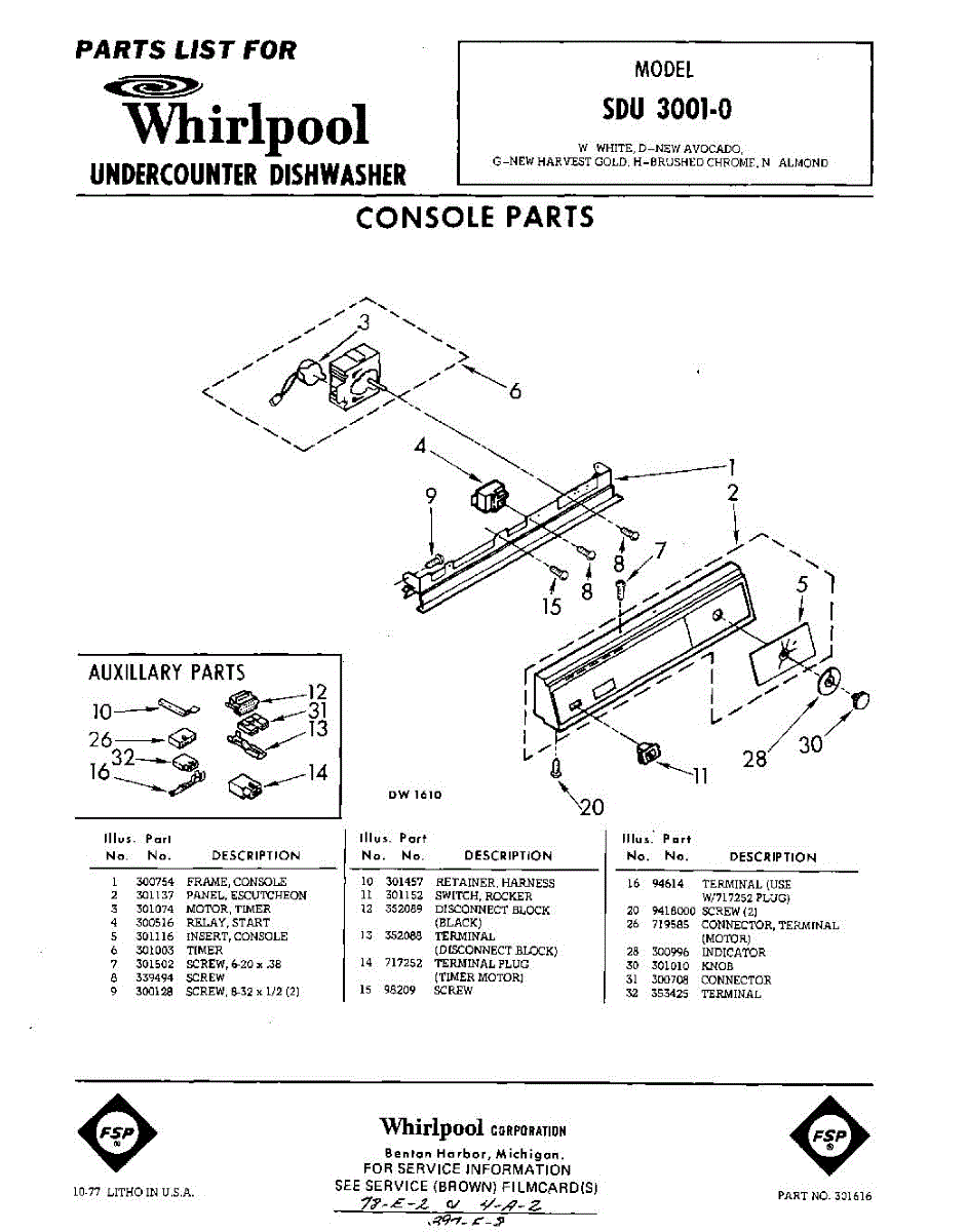 Parts for Whirlpool SDU30010: 01 - Console Parts