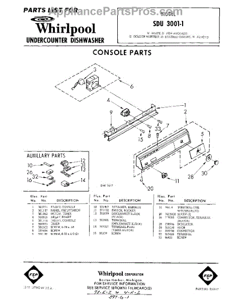 Parts for Whirlpool SDU30011: 01 - Console Parts