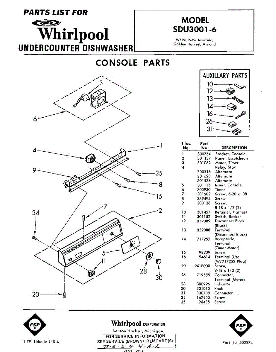 Parts for Whirlpool SDU30016: 01 - Console Parts