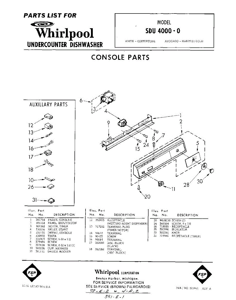 Parts for Whirlpool SDU40000: 01 - Console Parts