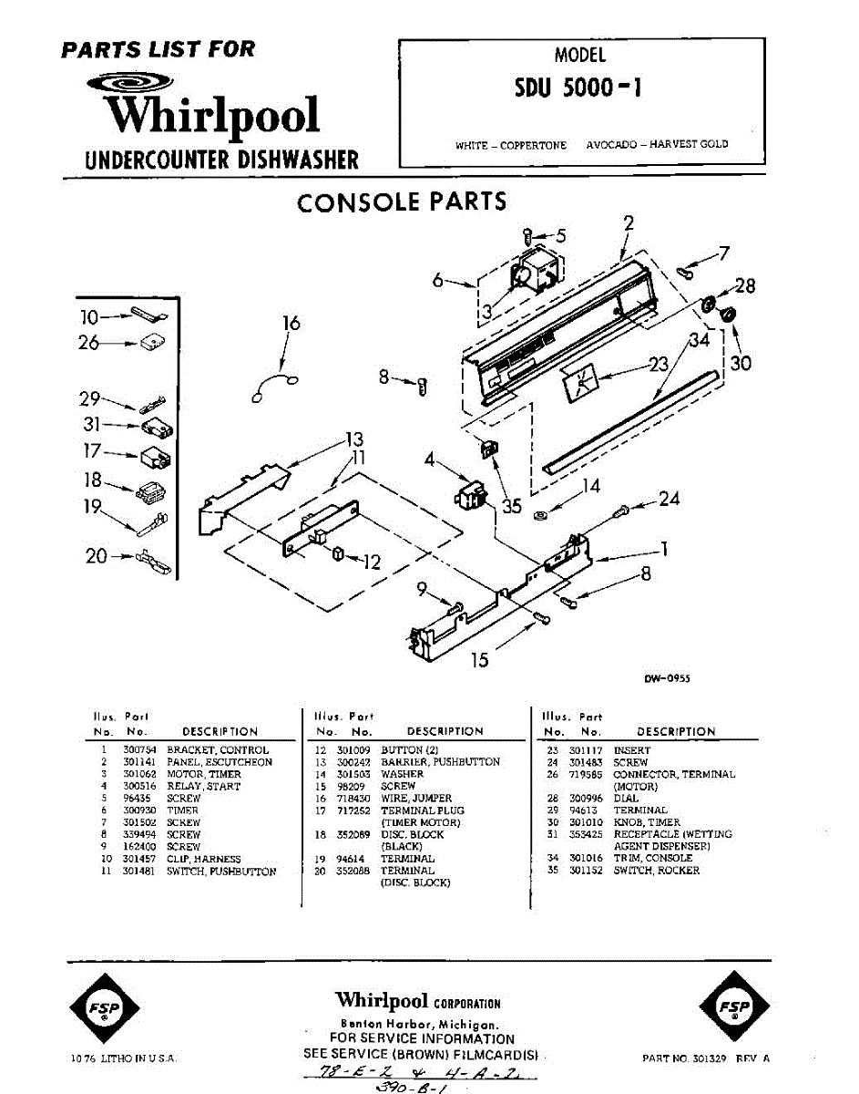 Parts for Whirlpool SDU50001: 01 - Console Parts