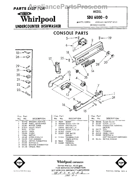 Parts for Whirlpool SDU60000: 01 - Console Parts