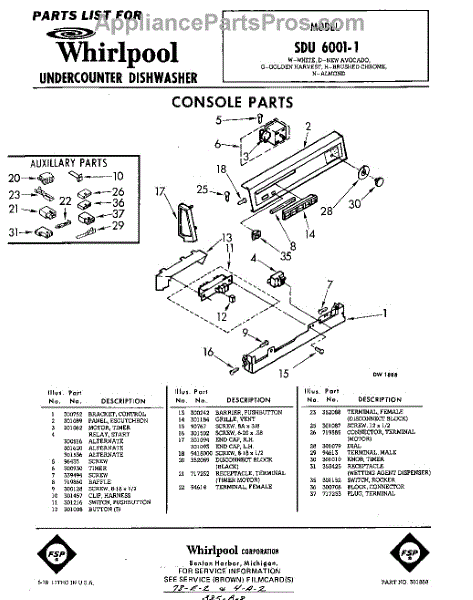 Parts for Whirlpool SDU60011: 01 - Console Parts