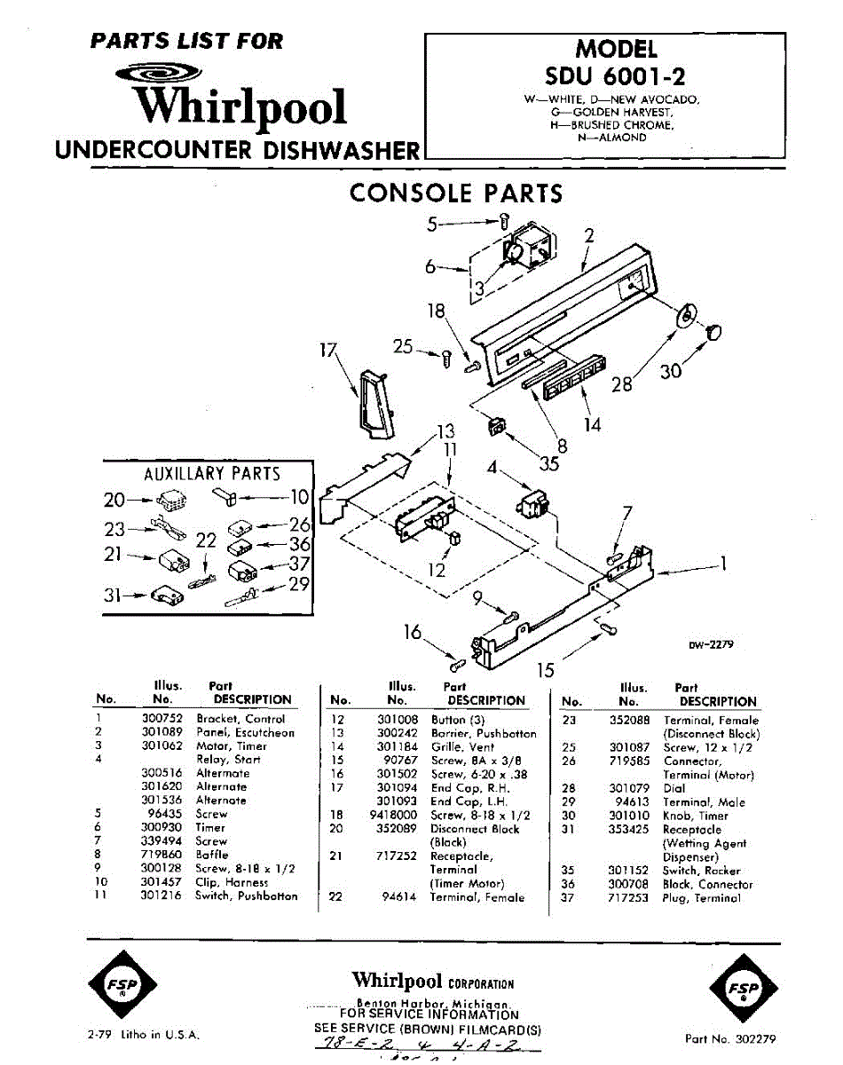 Parts for Whirlpool SDU60012: 01 - Console Parts