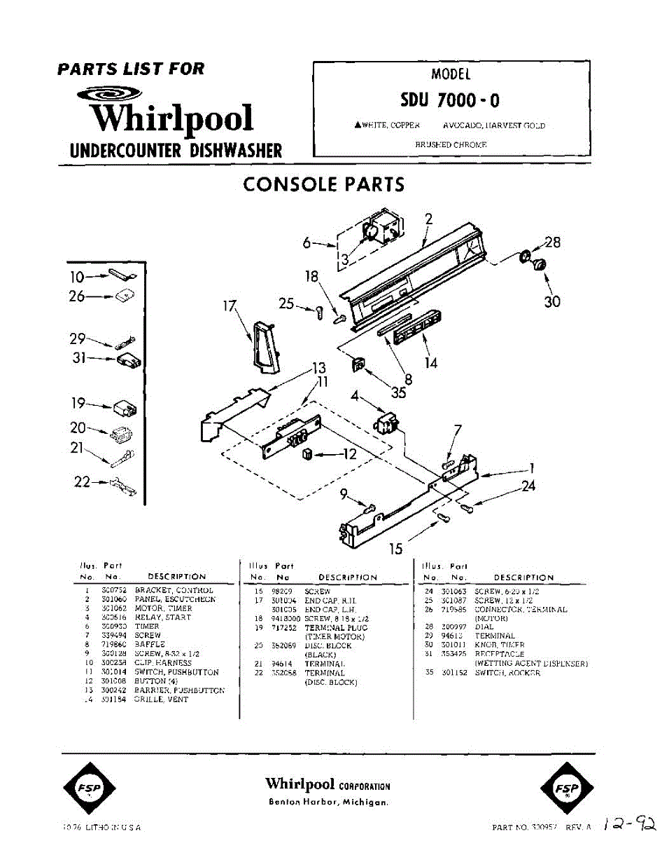 Parts for Whirlpool SDU70000: 01 - Console Parts