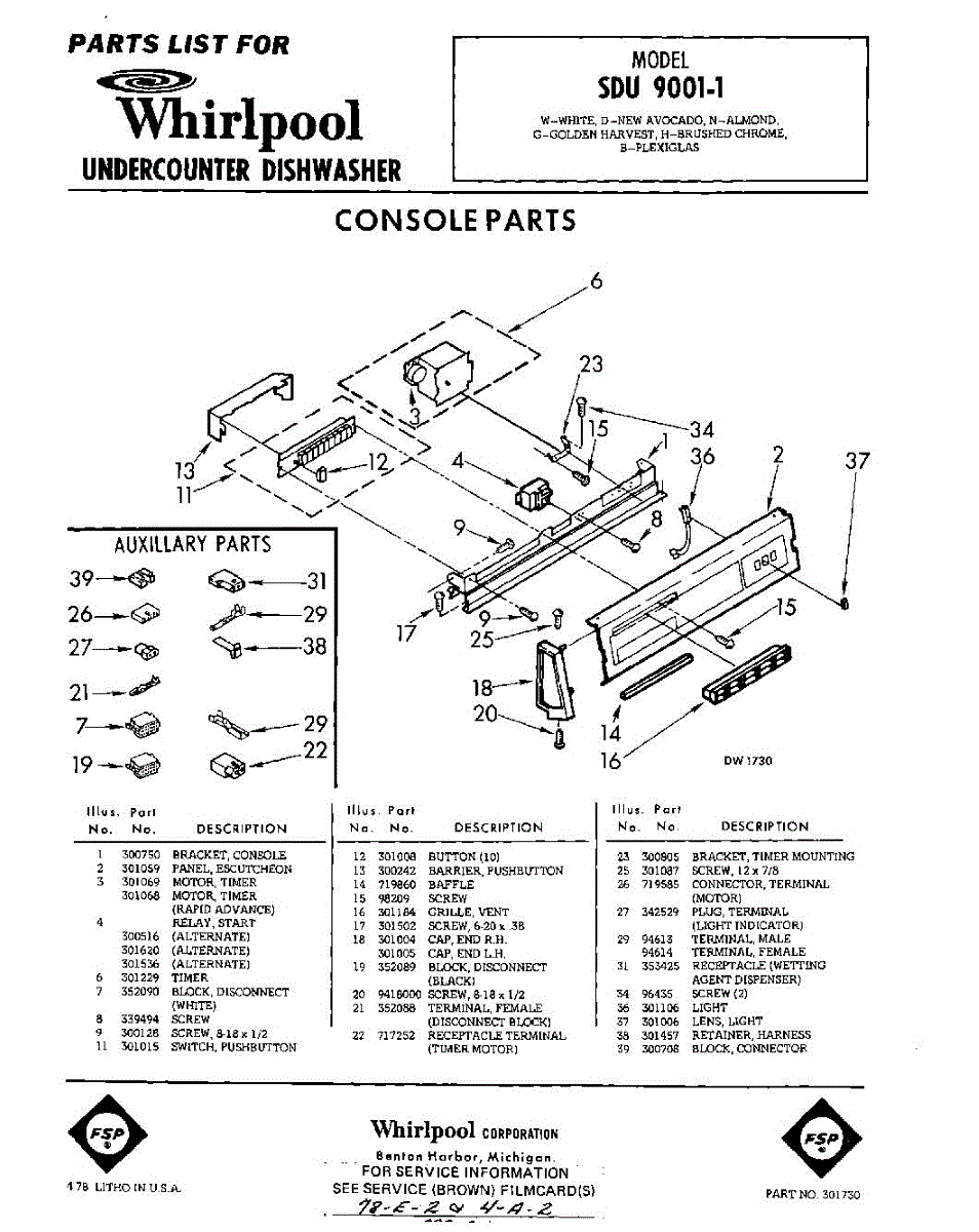 Parts for Whirlpool SDU90011: 01 - Console Parts
