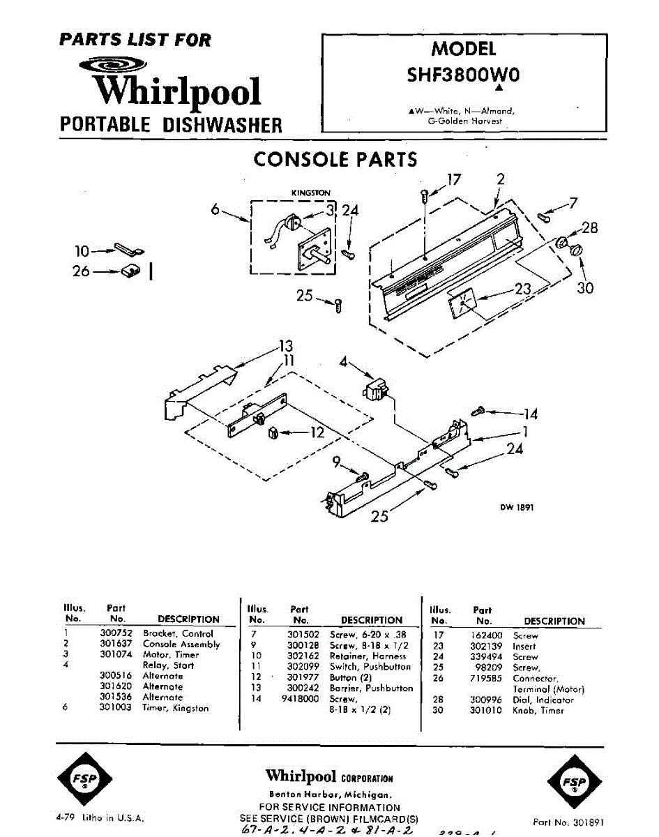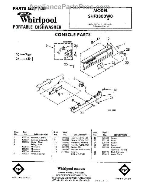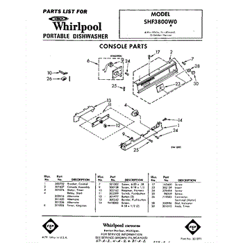 Parts for Whirlpool SHF3800W0: 01 - Console Parts