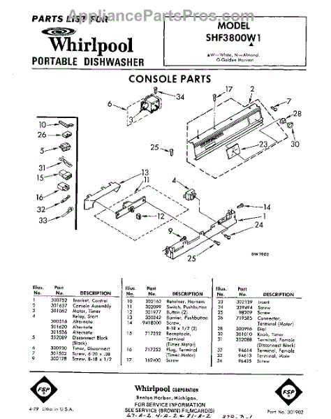 Parts for Whirlpool SHF3800W1: 01 - Console Parts