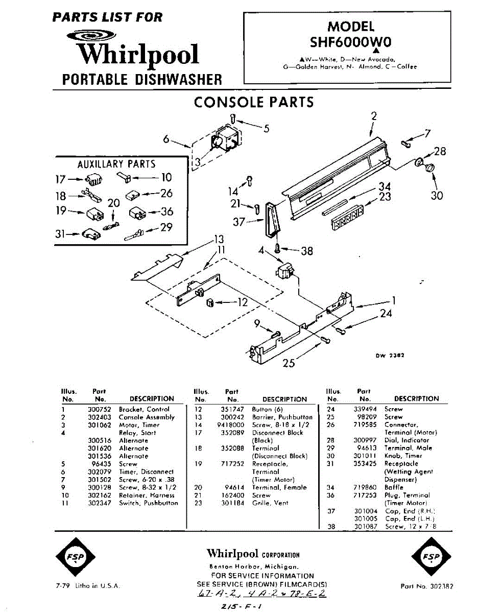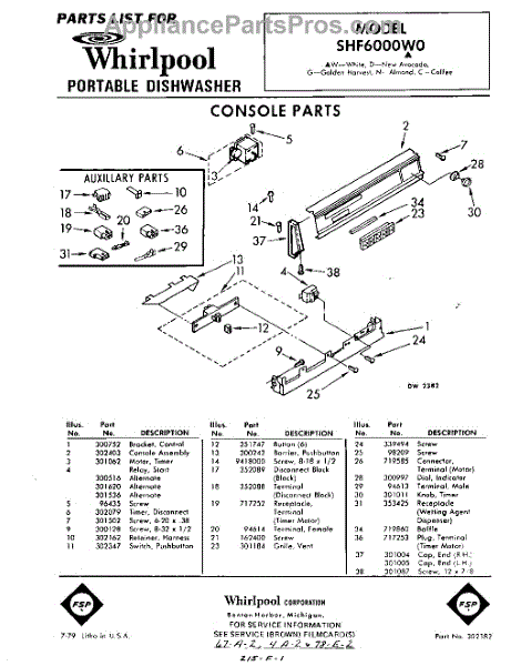 Parts for Whirlpool SHF6000W0: 01 - Console Parts