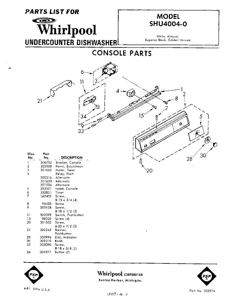 Parts for Whirlpool SHU40040: 01 - Console Parts